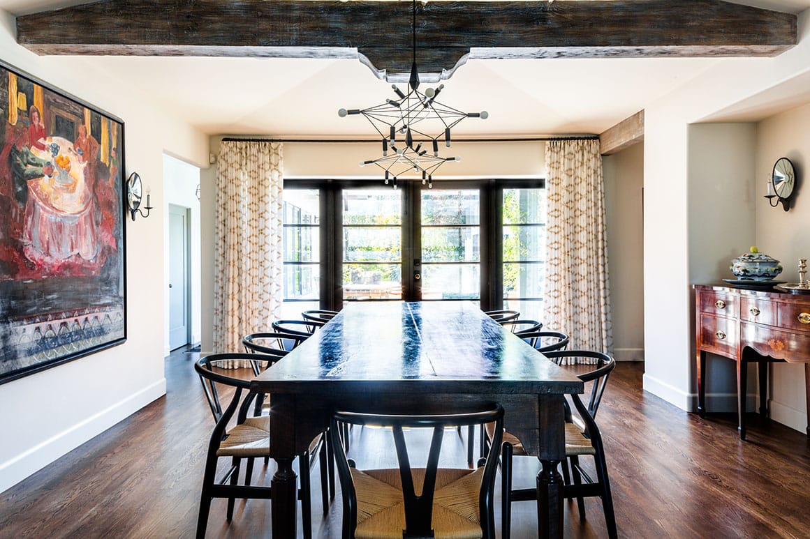 Alie used these pieces as a foundation for the interior design, for instance basing the living room design around a stunning chartreuse and pink rug that had belonged to Rachel’s parents. The cane bench in the living room was Rachel’s, to which Alie added a new custom sofa and an eclectic mix of pillows and accessories that were bought on trips abroad but also feature local Los Angeles designers. The dining room features a large painting of Rachel’s over a vintage dining room table and mid-century chairs, across from a buffet that was Ephraim’s grandmother’s, in a diverse mix that reflects the stories to be made and those to be remembered.