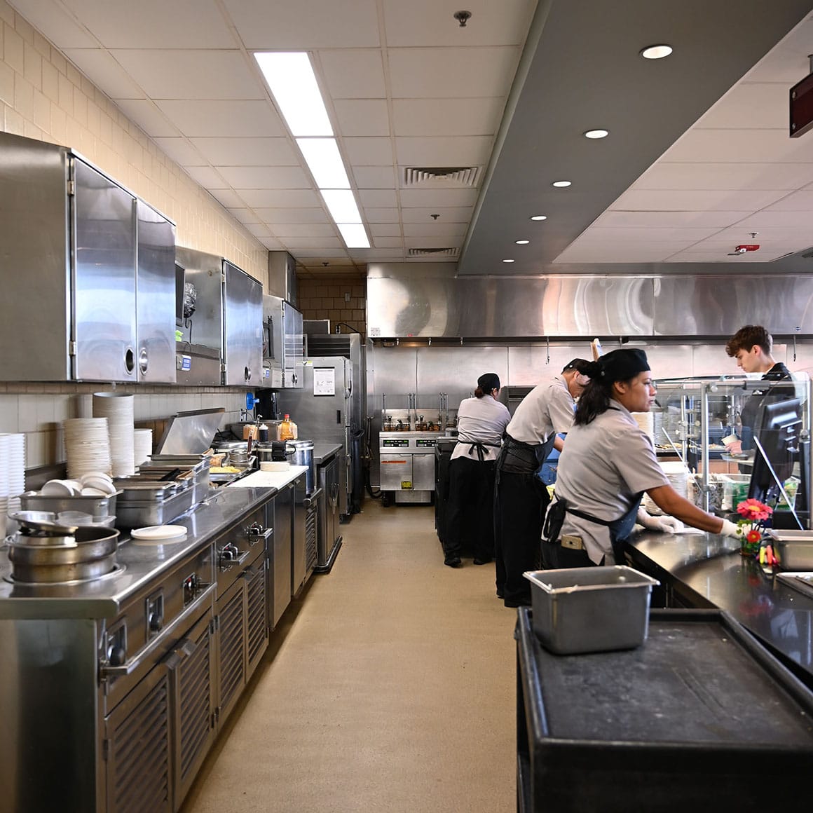 The UCLA Rieber Terrace Dining Renovation (‘Rendezvous Café’) doubles the existing serving capacity of this residence hall cafeteria while adding minimal new area to the 9,500 sq.ft. facility. The focus of the renovation is the back-of-house and support areas, to make improvements that significantly increase the quality of the service and capacity for the facility. The café features two food concepts, both of which have been extensively reworked to enhance the user experience and streamline through-put. The kitchen spaces have been reconfigured for efficiency and tuned to be responsive to innovations in the menu. A new scullery was constructed in an underutilized portion of an existing loading dock area, providing just enough new construction to facilitate the program changes.